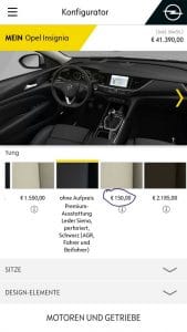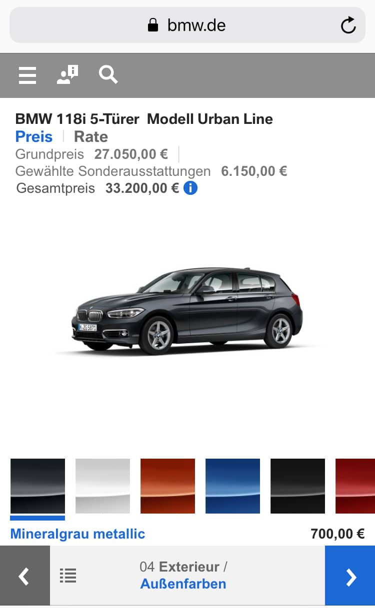 In der mobilen Variante öffnen sich die weiteren Konfigurationsschritte (Farbauswahl, Felgen, Polster) immer in einem neuen Fenster. Dadurch lassen sich verschiedene Varianten nur schwer testen. Schöner wäre es, wenn die Auswahl über einen horizontalen Slider gelöst wird.