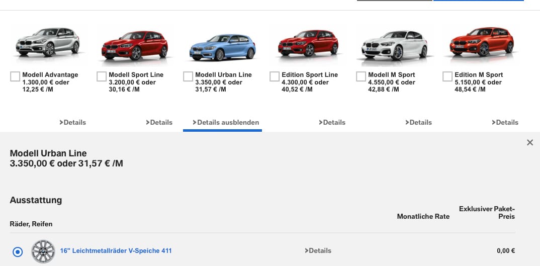 h Toll, jetzt darf ich die Modellvariante auswählen. Ich hab doch aber gar keine Ahnung was die auszeichnet? Oder soll ich mir selbst ausmalen was so tolle Begriffe wie „Advantage“, „Urban Line“ oder „Sport Line“ bedeuten? Beim Klick auf Details wird einem nicht geholfen. Der Leser erhält lediglich verschiedene Anpassungsmöglichkeiten und eine Auswahlliste. Leider erkenne ich keinen grundsätzlichen Unterschied der einzelnen Modellvarianten.