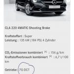 Nachdem ich beim Filter meine Wünsche, Benziner und Automatik, angegeben habe war ich über die Auswahl der Autos verwundet. Bei Mercedes muss der Nutzer wissen, dass die Getriebewahl nachträglich noch geändert werden darf. So kann beispielsweise auch ein CLA 180 mit einem Automatik-Getriebe geordert werden. Angezeigt wird im Konfigurator allerdings: Schaltgetriebe.
